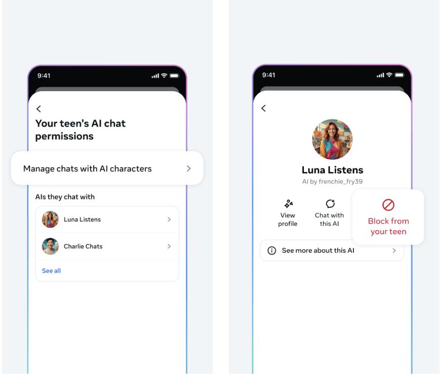 Meta on Friday previewed its upcoming parental control features for teens’ conversations with AI characters on its platforms. The features, which will be rolled out next year, include the ability to block certain characters and monitor conversation topics.